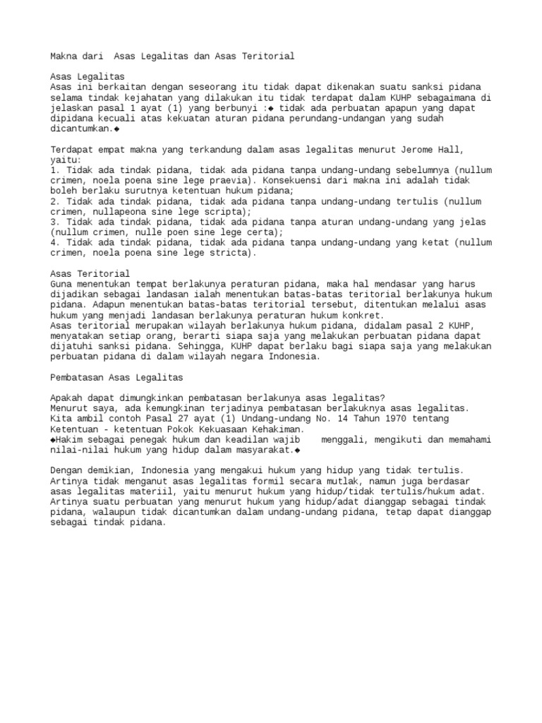 Asas ini tersirat di dalam Pasal 1 ayat 1 KUHP yang dirumuskan demikian. Landasan pemikiran pengecualian asas legalitas bahwa nullum crimen sine lege sebenarnya bukan batasan kedaulatan tetapi merupakan prinsip keadilan principle of. Moelyatno menulis bahwa asas legalitas itu mengandung tiga pengertian.