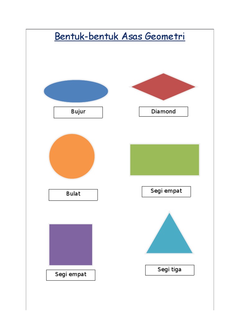 Kajian yang dijalankan ke atas kanak-kanak di tadika oleh Baroody. 25012017 Bentuk-bentuk asas geometri ini jika digabungkan boleh membentuk objek baru. Kenal dan label bentuk seperti bulatan segi empat sama segi tiga Namakan pepejal mudah dan asas atau menggunakan nama kurang formal seperti kotak atau bola.