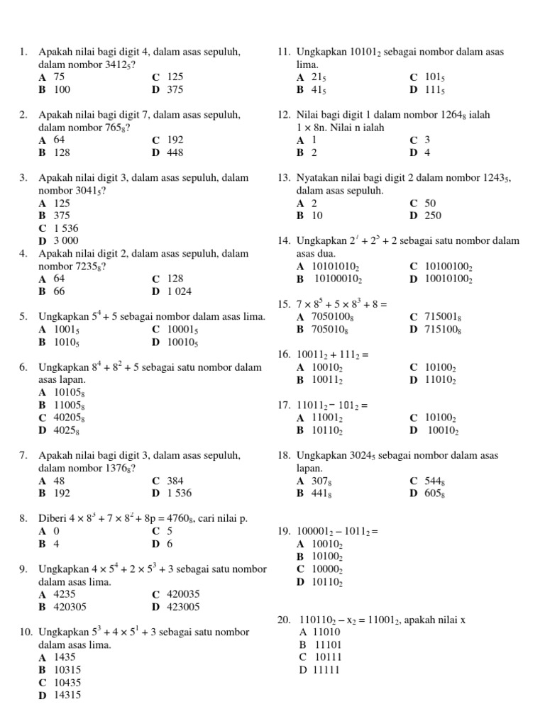 Asas 10 kepada asas lain mewakil dan menjelaskan nombor dalam pelbagai asas dari segi angka nilai tempat nilai digit dan nilai nombor berdasarkan proses pengumpulansp 211 part 2 penukaran asas nombor contoh soalan sebenar. 1 Nyatakan asas nombor bagi nombor 4527 a Asas 2 b Asas 4 c Asas 5 d Asas 7 2 Nyatakan digit yang digunakan dalam asas 3 a 12 b 012 c 0123 d 123 3 Perhatikan urutan nombor berikut.