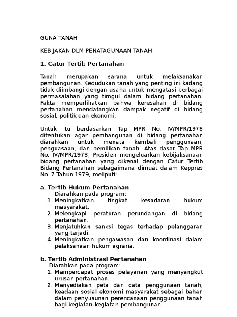 Scribd es red social de lectura y publicacin ms importante del mundo. Rencana Tata wilayah1 Kegiatan pendaftaran tanah di Indonesia yang diselenggarakan mulai tanggal 24 September 1961 berdasar ketentuan Pasal 19 Undang-undang Pokok Agraria UUPA adalh bertujuan untuk menjamin kepastian hokum 1Lihat Penjelasan Umum Penatagunaan Tanah Peraturan Pemerintah Republik Indonesia Nomor 16 Tahun 2004. 1582008 TUJUAN TATA GUNA TANAH.