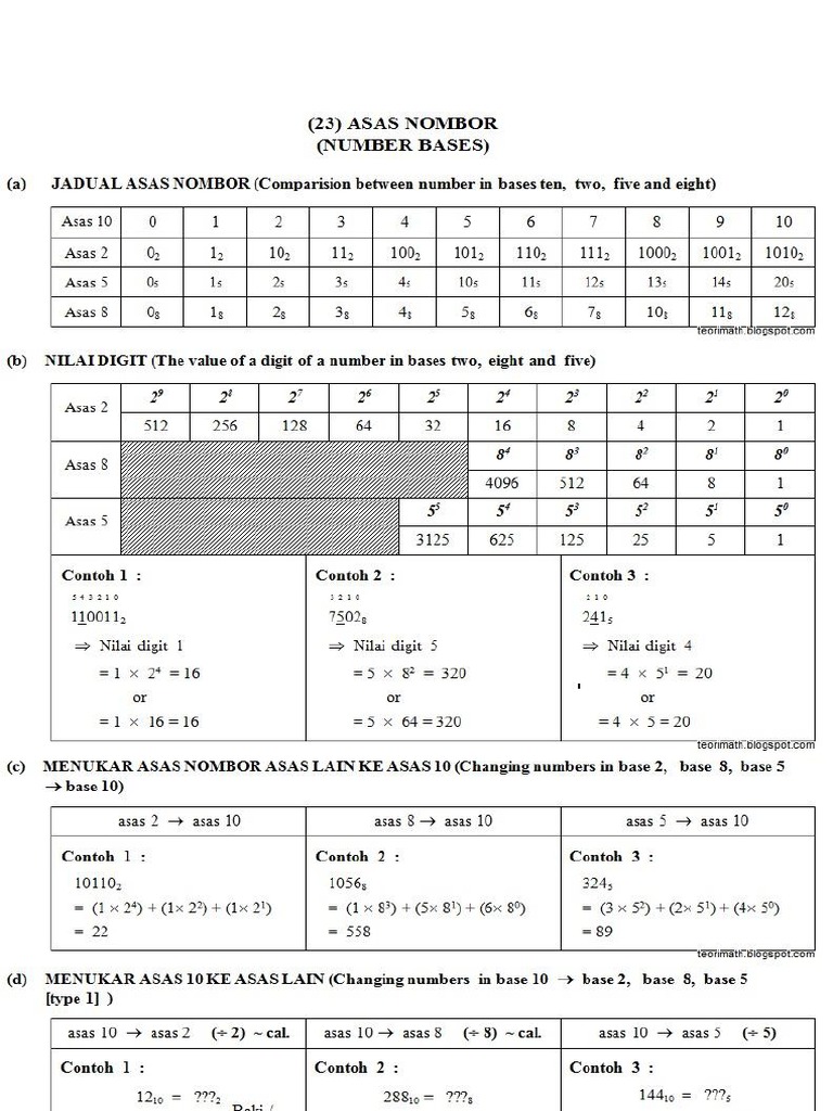 12 Perlapanan Asas 8 ke Perpuluhan Asas 10 atau 83 Perlapanan Asas 8 kepada Perpuluhan Asas 10 atau 85 Perlapanan Asas 8 -. AKaedah Biasa -tukarkan asas nombor ke asas 10 -tukarkan hasilnya dalam asas 10 ke asas yang dikehendaki dengan menggunnakan pembahagian berulang. 26062021 Jadual asas nombor comparision between number in bases ten two five and eight nilai digit the value of a digit of a number in bases two eight and five menukar asas nombor asas lain ke asas 10 changing numbers in base 2 base 8 base 5.