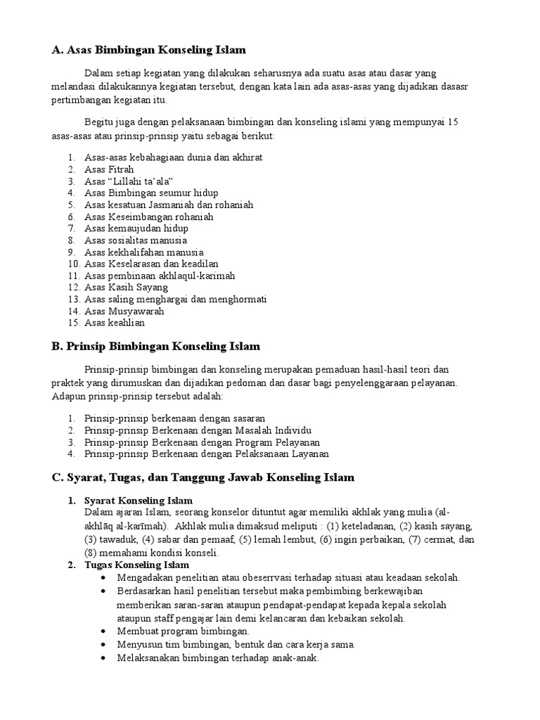Asas bimbingan konseling islam. Berdasarkan landasan-landasan tersebut dijabarkan asas-asas atau prinsip-prinsip pelaksanaan bimbingan dan konseling sebagai berikut. Asas ketauhidan ketaqwaan akhlak al-karimah kebahagiaan dunia akhirat cinta kasih toleransi kebahagiaan diri dan kemaslahatan. Bimbingan dan konseling Islami tujuannya adalah membantu klien atau konseli yakni orang yang dibimbing mencapai kebahagiaan hidup yang senantiasa.